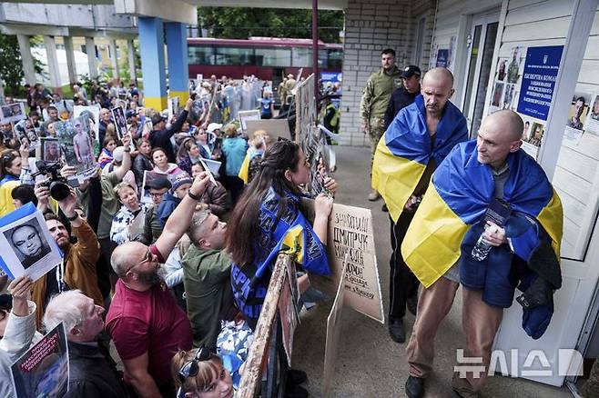 [체르느히우=AP/뉴시스] 러시아와의 포로 교환으로 석방된 우크라이나 군인들이 26일(현지 시간) 체르느히우에 도착해 실종된 가족의 사진을 든 사람들 앞을 지나가고 있다. 러시아와 우크라이나가 이날 추가로 포로를 교환했으며 그 규모는 알려지지 않았다. 2025.06.27.