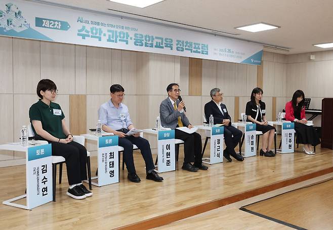 [서울=뉴시스] 정근식(왼쪽 네번쨰) 서울시교육감이 26일 서울 송파구 해누리초·중 이음학교에서 열린 제2차 수학·과학·융합교육 정책포럼에서 종합토론을 하고 있다.(사진=서울시교육청 제공) 2025.06.27. photo@newsis.com *재판매 및 DB 금지