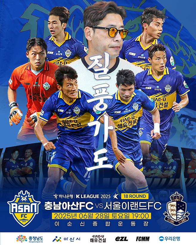 또한 이날 경기에는 충남아산FC의 공식 응원가인 질풍가도가 6년 만에 부활한다. 2018년 K리그2 우승 시상식에서 처음 선보였던 이 곡은, 팬들의 추억과 감동이 고스란히 담긴 상징적인 노래다. 이번 시즌 구단의 도약과 승격을 기원하며 다시 이순신종합운동장에서 울려 퍼질 예정이다.