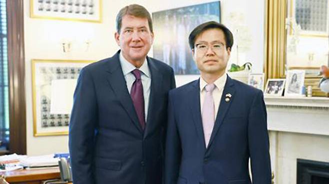 ▲ 여한구 산업통상자원부 통상교섭본부장은 26일(현지시간) 미국 워싱턴DC 미국 의회 빌 해거티(Bill Hagerty) 상원의원 집무실에서 면담을 갖고, 한미 통상협상을 통한 상호 윈-윈 협력관계 구축 의지를 강조했다.