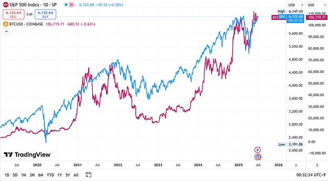 실제 S&P500과 비트코인의 가격 추이로만 봐도 올해들어선 거의 같은 흐름을 보이고 있다.