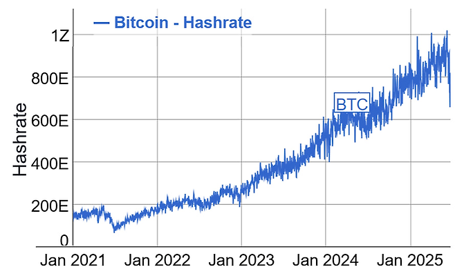 공교롭게도 미국이 이란을 공습한 지난 22일부터 해시레이트 급락이 발생했다.