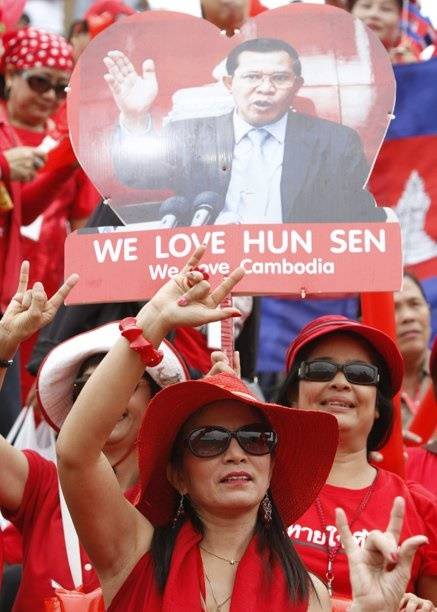 | ▲ 우리는 훈센을 사랑한다 "당시 친선 축구 경기 응원석에는 태국 레드셔츠 지지자들이 'We Love Hun Sen'이라는 문구가 적힌 피켓을 들고 나와, 양국 선수들을 함께 응원하는 모습을 보이기도 했다." |