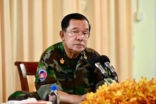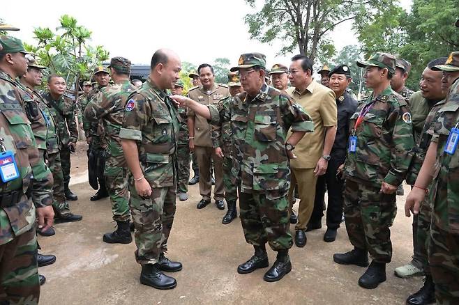 | ▲ 군복을 입은 채 국경 지대를 방문한 훈센 상원의장이 고위급 장성들에게 메시지를 전하고 있다. |
