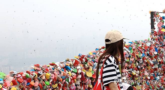 (서울=연합뉴스) 최재구 기자 = 27일 서울 남산공원 전망대에서 관광객들이 날아다니는 러브버그로 불편을 겪고 있다. 2025.6.27