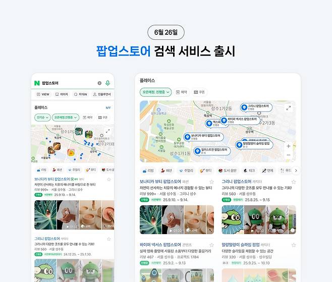 스마트플레이스에 등록된 팝업스토어 정보를 네이버 지도와 플레이스, 통합검색에서 확인 가능하다.