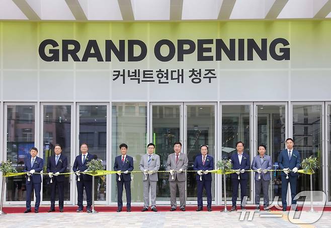(서울=뉴스1) = 27일 충북 청주시 커넥트현대 청주 정문 앞에서 열린 오프닝 세레모니에서 장호진 현대지에프홀딩스 사장(맨 왼쪽)과 정지영 현대백화점 사장(맨 오른쪽) 등 참석자들이 테이프 커팅식을 진행하고 있다. (현대백화점그룹 제공. 재판매 및 DB 금지) 2025.6.27/뉴스1