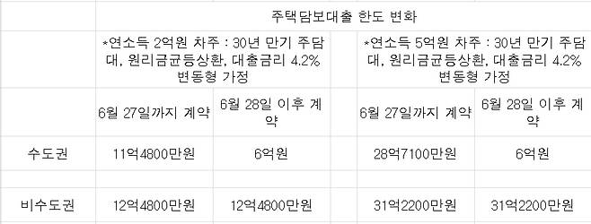 연소득 2억원 차주가 30년 만기로 대출금리 4.2% 변동형 주담대를 원리금균등상환 방식으로 받는다고 가정하자. 이날까지 계약서에 도장을 찍은 경우라면 수도권에서 대출이 DSR(총부채원리금상환비율) 40% 규제에 따라 최대 11억4800만원까지 나오지만, 이날 이후 계약하는 경우에는 최대 한도가 6억원으로 줄어든다.