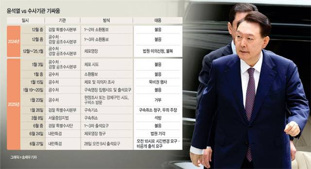 법조계에서는 윤 전 대통령 측이 여론 악화를 의식해 불출석·묵비권 등 수사 회피 및 지연 전략에서 선회했다고 보고 있다. 특검 소환을 비롯해 수사기관에 ‘당당하게 응하겠다’는 입장을 냈지만 실제 행동은 매번 ‘비협조적’이었기 때문이다. 윤 전 대통령은 지난해 12월 검찰 비상계엄 특별수사본부의 2차례 소환통보에 불응한 데 이어 사건을 넘겨받은 공수처의 3차례 소환통보 역시 거부했다. 지난 1월 공수처가 체포영장을 집행하는 과정에서 경찰과 대통령경호처가 대치하는 상황까지 빚어졌다. 윤 전 대통령은 체포 이후 11시간 가까이 이어진 공수처 첫 대면조사에서도 묵비권으로 일관했다. 지난 3월 재판부의 구속취소 결정으로 풀려난 윤 전 대통령은 이후에도 특수공무집행방해 혐의 등으로 경찰로부터 3차례 소환통보를 받았지만 이마저 ‘특검 수사’ 등을 이유로 불응했다. 한 차장검사 출신 변호사는 “윤 전 대통령이 수사기관 소환에 응할 수 없다며 대는 이유가 전반적으로 납득하기 어렵다”며 “행동 명분이 줄어들면 강성 지지층을 제외한 여론이 점차 등을 돌리게 될 것”이라고 평가했다.
