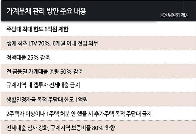 수도권·규제지역(투기·투기과열지역, 조정대상지역) 내에서는 다주택자의 대출을 활용한 주택 추가 구입을 금지하고 무주택자에 대해서도 실거주 목적이 아닌 대출을 제한하는 방식이다. 특히 주담대 한도도 최대 6억원으로 제한해 주택 구입시 과도한 대출에 의존하는 것을 막기로 했다. 주담대 여신한도를 정부가 정책으로 제한하는 것은 종전에 없던 새로운 규제다.
