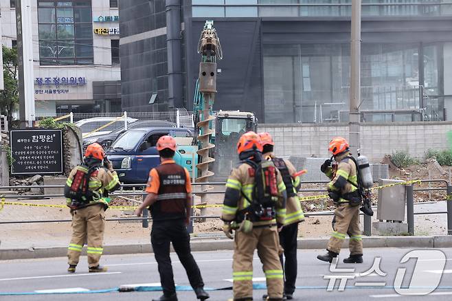 (서울=뉴스1) 김성진 기자 = 27일 오전 서울 서초구 지하철 2호선 교대역 일대에서 작업 중이던 굴착기가 도시가스 배관을 건드려 가스가 유출되는 사고가 발생했다. 서울지하철공사는 사고 직후 교대역을 지나는 2·3호선 열차를 무정차 통과시키고 있다. 2025.6.27/뉴스1