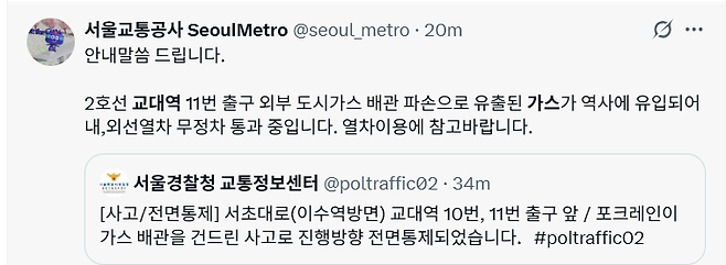 서울교통공사는 "오늘 오전 10시 47분쯤, 교대역 11번 출구 앞에서 외부 도시가스 배관 파손으로 유출된 가스가 역사로 유입됐다"며 "교대역 내·외선 열차 무정차 통과를 실시하고 있다"고 밝혔습니다.