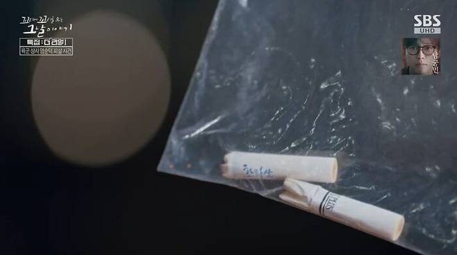 바로 담배꽁초 2개. 2001년 사건 당일 사망한 염 상사의 머리맡에서, 2점의 디스플러스 담배꽁초가 발견됐어. 현장 수거 당시 바닥에 재가 남은 걸로 봐서, 누군가 바로 직전까지 피우던 걸로 보여. 이건 바로, 누군가 범죄 현장에 있었다는 이야기야.