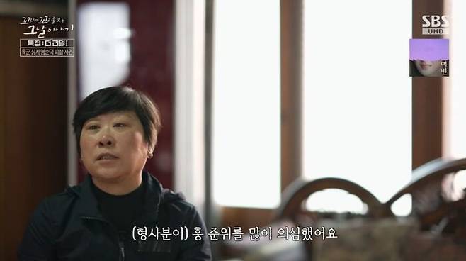 "그때 당시 저희 집에 자주 왔다 갔다 하시던 형사 분이 있는데, '잘 지내시죠? 더 진전이 없어서 죄송해요' 말이라도 그렇게 해주셨고, 고맙게 생각했죠. 왔다 갔다 해주시니까. 헌병대는 왔다 갔다 안 해주는데 그래도. '그냥 지나다 들렀어요' 이렇게 하면서 들려주시고 그랬죠. (형사분이) 홍 준위를 많이 의심했어요. 홍 준위를 이제 범인인 것처럼 계속 얘기를 했었어요."