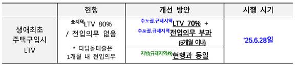 수도권·규제지역 생애 최초 주택 구입 목적 주담대 LTV를 80%에서 70%로 강화하고, 전입 의무(6개월 이내)도 부과한다. 이 방안은 정책대출(디딤돌, 보금자리론)에도 동일하게 적용한다.