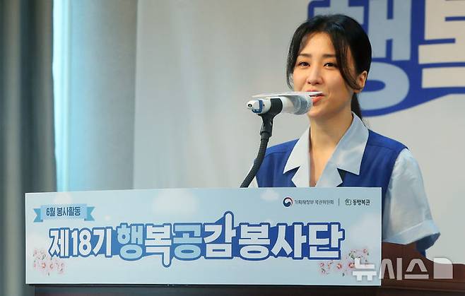 [서울=뉴시스] 김혜진 기자 = 복권위원회 홍보대사인 배우 박하선이 27일 오전 서울 중구 보훈회관에서 열린 복권위원회 행복공감봉사단 보훈대상자 대상 배식봉사활동에 앞서 인사말을 하고 있다. 2025.06.27. jini@newsis.com