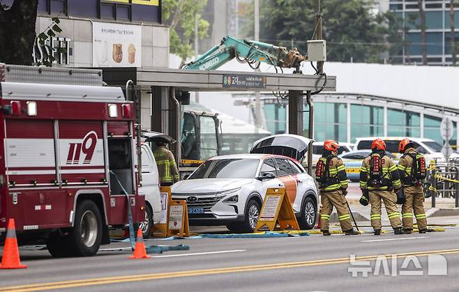 [서울=뉴시스] 김선웅 기자 = 27일 서울 서초구 교대역 인근에서 발생한 도시가스 유출 사고 현장에서 소방대원들이 조사를 하고 있다.