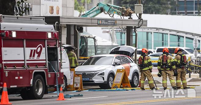 [서울=뉴시스] 김선웅 기자 = 27일 서울 서초구 교대역 인근에서 발생한 도시가스 유출 사고 현장에서 소방대원들이 조사를 하고 있다.