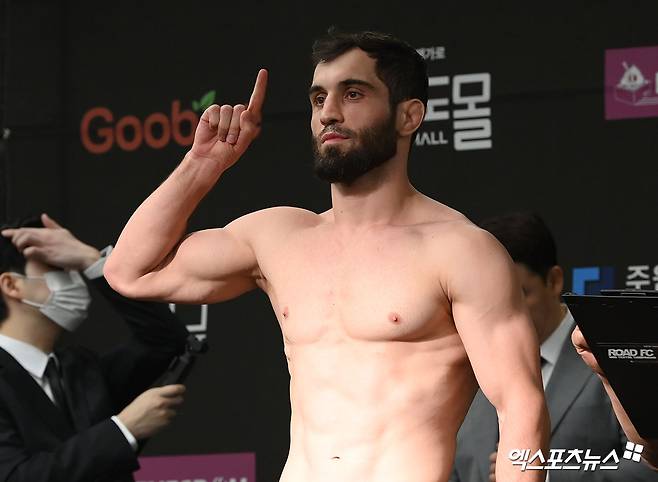 (엑스포츠뉴스 고아라 기자) 27일 오후 서울 서대문구 스위스그랜드호텔 컨벤션센터에서 열린 ‘굽네 ROAD FC 073’ 공식 계체량에서 카밀 마고메도프가 계체량을 통과한 뒤 포즈를 취하고 있다.