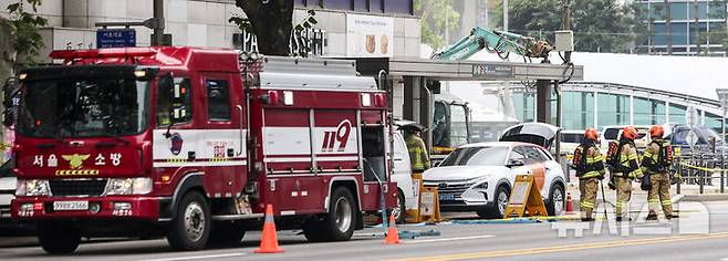 [서울=뉴시스] 김선웅 기자 = 27일 서울 서초구 교대역 인근에서 발생한 도시가스 유출 사고 현장에서 소방대원들이 조사를 하고 있다.