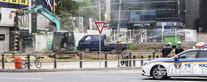 이에 따라 서울 지하철 2호선과 3호선 열차가 해당 역을 무정차로 통과하고 있으며 유관 기관이 현장 복구 작업을 진행 중이다. 사진은 도시가스 누출 일으킨 굴착기. 2025.06.27. mangusta@newsis.com