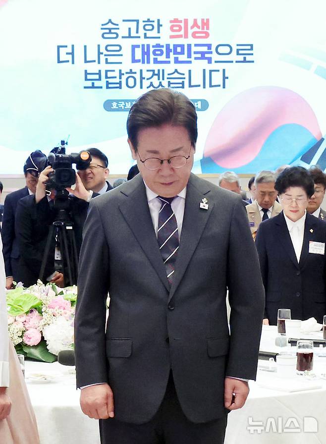 [서울=뉴시스] 최진석 기자 = 이재명 대통령과 부인 김혜경 여사가 27일 청와대 영빈관에서 열린 '호국보훈의 달, 대통령의 초대' 행사에서 묵념하고 있다. (대통령실통신사진기자단) 2025.06.27. myjs@newsis.com