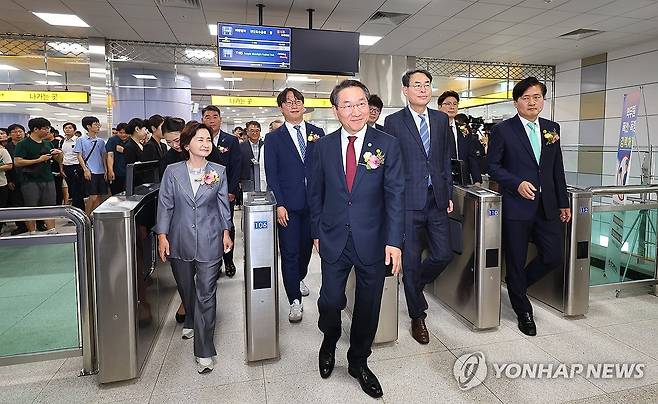 (인천=연합뉴스) 임순석 기자 = 27일 인천 서구 신검단중앙역에서 열린 인천도시철도 1호선 검단연장선 개통기념식에서 유정복 시장, 강범석 서구청장, 모경종 국회의원 등 참석자들이 개찰구를 통과하고 있다.