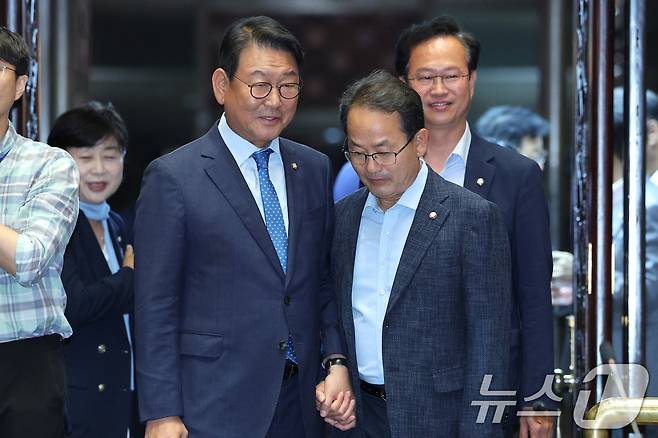 (서울=뉴스1) 신웅수 기자 = 김교흥 더불어민주당 의원(왼쪽)이 27일 오후 서울 여의도 국회에서 열린 민주당 의원총회에서 의원들과 인사하고 있다. 2025.6.27/뉴스1