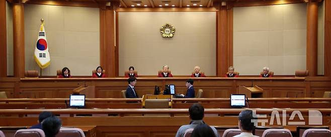 [서울=뉴시스] 김선웅 기자 = 김형두 헌법재판소장 권한대행 재판관 등 헌법재판관들이 27일 서울 종로구 헌법재판소에서 6월 심판사건에 대한 선고를 하기 위해 대심판정 자리에 착석해 있다.