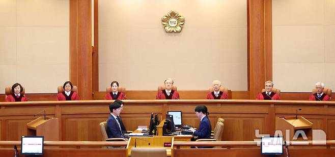 [서울=뉴시스] 김선웅 기자 = 김형두 헌법재판소장 권한대행 재판관 등 헌법재판관들이 27일 서울 종로구 헌법재판소에서 6월 심판사건에 대한 선고를 하기 위해 대심판정 자리에 착석해 있다.