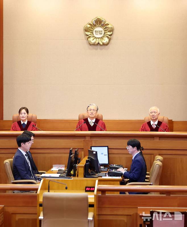 [서울=뉴시스] 김선웅 기자 = 김형두 헌법재판소장 권한대행 재판관 등 헌법재판관들이 27일 서울 종로구 헌법재판소에서 6월 심판사건에 대한 선고를 하기 위해 대심판정 자리에 착석해 있다.