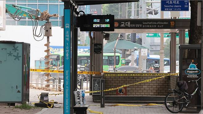 ▲ 27일 오전 서울 서초구 지하철 2호선 교대역의 11번 출구 인근 공사 현장에서 굴착기가 도시가스 배관을 뚫는 사고가 발생해 교대역 사거리 일대가 통제되고 있다.