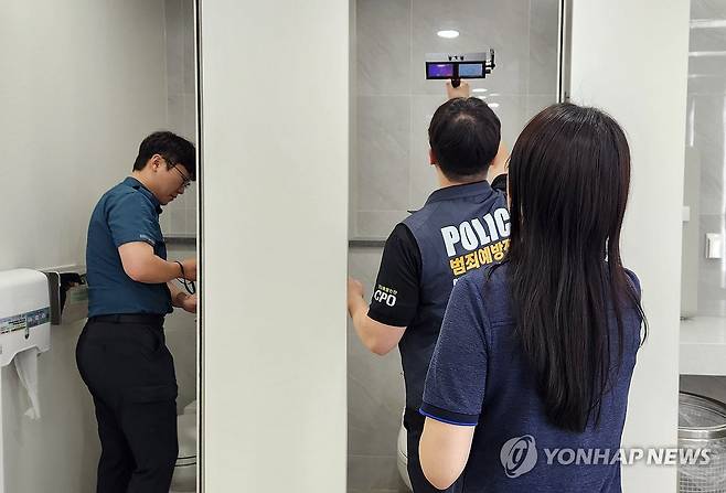 (구미=연합뉴스) 경북 구미경찰서는 27일 대경선 사곡역에서 각 시설물 내 불법촬영 카메라 설치 여부를 확인하고 시민들 대상 불법촬영 범죄예방 교육 등을 했다고 밝혔다. 김동욱 구미경찰서장은 "단발성에 그치지 않고 반복·지속적인 캠페인으로 불법촬영 범죄 근절로 이용객들의 안전에 최선을 다하겠다"고 했다. 사진은 불법촬영 예방 활동 모습. 2025.6.27 [구미경찰서 제공. 재판매 및 DB 금지]