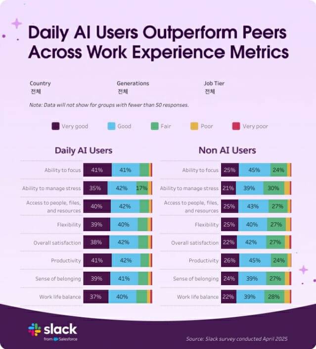 A: AI를 매일 사용하는 직장인은 그렇지 않은 동료보다 생산성이 64% 높고, 업무 만족도가 81% 더 높다. 또한 집중력은 58% 더 뛰어나며, 동료들과의 연결감은 246% 더 높고, 직장에서의 소속감도 62% 더 크다.