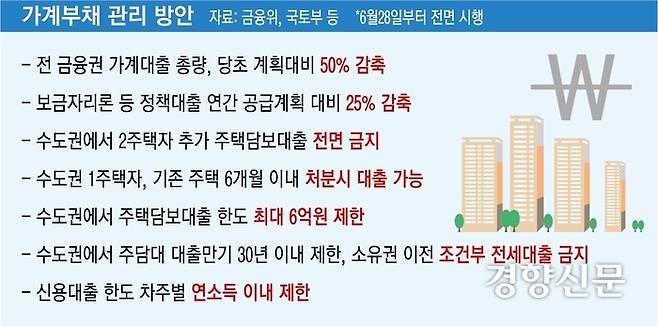 정부가 27일 가계대출 관리 방안 중 가장 눈에 띄는 건 ‘6억원’ 주택담보대출 한도 설정이다. 이는 서울 아파트값 급등세를 이끈 ‘갈아타기’ 수요와 ‘갭 투자’ 매매를 수요 단계에서 억제하겠다는 강력한 의지로 풀이된다. 10억원이 넘는 빚을 내 ‘똘똘한 한 채’로 갈아타려는 경향을 주담대 한도 제한으로, 토지거래허가구역 인근 한강벨트 지역에서 풍선효과를 보이고 있는 갭투자 수요 역시 조건부 전세대출 금지 등으로 틀어 막겠다는 것이다.