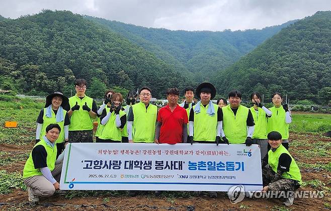 (춘천=연합뉴스) 27일 강원 춘천시 사북면 원평리에서 열린 농촌 일손 돕기 행사에서 농협 강원본부 임직원과 강원대학교 농업생명과학대학 학생회가 기념 촬영하고 있다. 2025.6.27 [농협 강원본부 제공. 재판매 및 DB 금지]