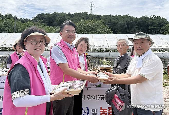 (횡성=연합뉴스) 27일 강원 동해시 농가에서 열린 '이심점심 중식 지원 및 농촌 일손 돕기' 행사에서 김경록 본부장 등 농협 강원본부 임직원과 고향주부모임 회원들이 지역 농업인들에게 중식 도시락을 전달한 뒤 기념 촬영하고 있다.