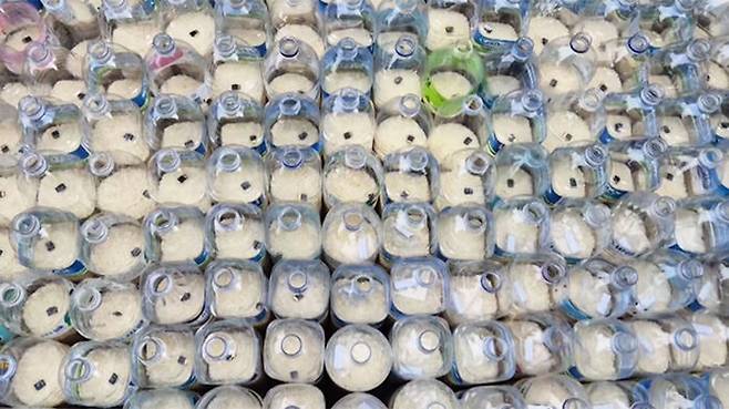 ▲ 한 탈북민 단체가 강화도에서 북한 황해도 쪽으로 보낸 쌀과 USB 등이 담긴 페트병