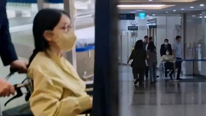 김 여사는 노란색 외투에 마스크를 쓰고 있었고 윤석열 전 대통령이 김 여사가 탄 휠체어를 밀었습니다.