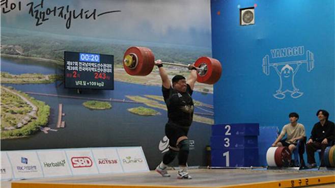 송영환은 강원 양구 용하 체육관에서 열린 2025 전국역도선수권대회 남자 109㎏ 이상급 경기 용상 2차 시기에서 243㎏을 들었습니다.