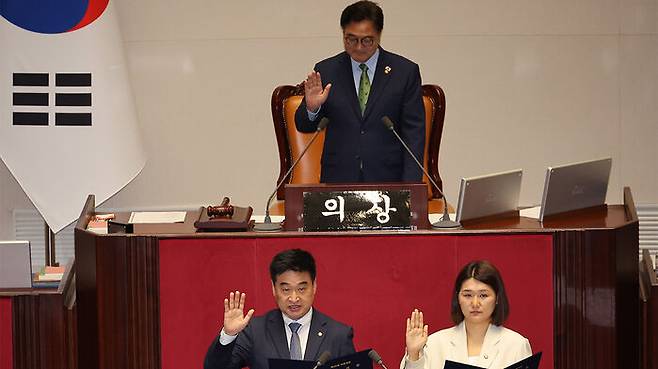 ▲ 위성락 국가안보실장과 강유정 대통령실 대변인의 국회의원직을 각각 승계한 손솔·최혁진 의원이 27일 국회 본회의에서 선서하고 있다.