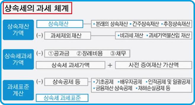 상속에 있어 총 상속재산가액은 본래의 상속재산인 상속개시일 현재 피상속인 명의재산과 보험금, 신탁재산 퇴직금 등의 간주상속재산, 그리고 일정요건에 해당하는 재산처분대가, 예금 순 인출액과 채무부담가액인 추정상속재산을 합산한 금액이다. 여기서 비과세 재산가액을 차감하고, 사전증여재산과 조세특례제한법상 특례증여재산을 가산한 금액이 상속세 과세가액이 된다.