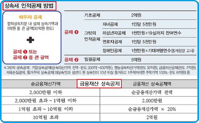 거주자의 사망으로 배우자가 실제 상속받은 금액은 상속세 과세가액에서 30억 원을 한도로 공제한다. 다만 그 금액은 상속재산의 가액에서 배우자의 법정상속분을 곱하여 계산한 금액에서 배우자에게 증여한 재산에 대한 과세표준을 뺀 금액을 기준으로 한다. 주의할 점은 배우자가 실제 상속받은 금액에 대해서만 배우자 상속공제를 받을 수 있다는 점이다. 따라서 상속인들은 배우자 상속공제를 최대한 적용받을 수 있도록 ‘상속재산 협의분할서’를 작성할 필요가 있다.