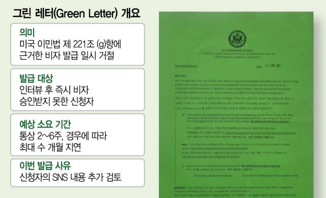 그린레터는 미국 이민법 221조에 의거해 비자 신청이 거절되는 경우를 일컫는 비공식 용어다. 통상 녹색 종이로 안내가 이뤄져 이런 이름이 붙었다. 인터뷰를 마치고도 비자 담당 영사가 발급 여부를 확정하지 못했을 때 주로 발행된다. 최종적 거절은 아니기에 추가 심사를 거친 후 비자가 발급될 가능성은 여전히 높다. 문제는 최종 승인을 받기까지 시간이 얼마나 걸릴지는 알 수 없다는 점이다. 이번 사태 이전까지는 통상 2주에서 6주 이내 승인되는 경우가 많았다고 알려져 있다. 그러나 길게는 3개월 이상 지연되는 경우도 일부 있어왔다.