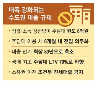총부채원리금상환비율(DSR)을 계산할 때 정책대출과 전세대출을 포함하는 방안만 남겨놓고 그 외에 모든 대출 관련 규제가 총망라됐다는 평가다. 정부 방안에 따르면 1주택 이상 보유자는 추가 주택을 구매하기 위한 주택담보대출이 전면 금지된다. 1주택 보유자는 새로운 주택을 구입하려면 기존 집을 6개월 이내에 처분해야 대출을 받을 수 있고 6개월 이내 전입도 의무화된다. 수도권·규제지역 내에 생애 최초 주택을 구입할 목적으로 대출을 받을 때 적용하는 주택담보대출비율(LTV)도 기존 80%에서 70%로 축소되며 6개월 내 실거주 의무가 부과된다. 갭투자를 부추긴다는 비판을 받았던 소유권 이전 조건부 전세대출 역시 금지된다. 신용대출 한도도 연소득 규모 이내로 감축된다.