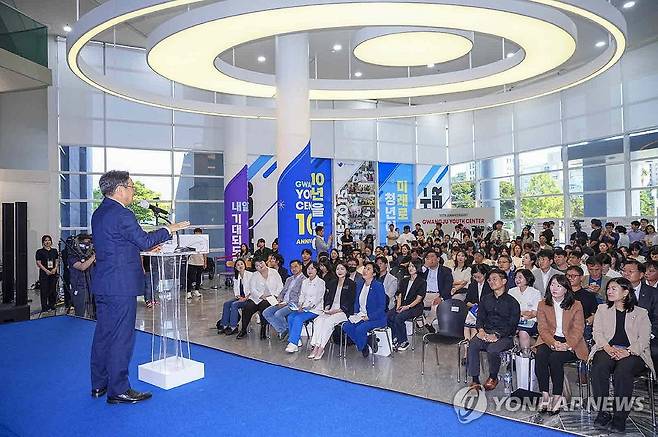 (광주=연합뉴스) 강기정 광주시장이 27일 오후 광주청년센터 개관 10주년 기념식에 참석해 청년들과 토크쇼를 진행하고 있다. 강 시장은 "청년들의 든든한 '기댈 언덕'이 되겠다"고 강조했다. 2025.6.27 [광주시 제공. 재판매 및 DB 금지]