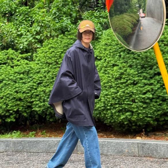 김나영이 시크하게 소화한 판초 우의 스타일링을 참고해 보자. 비에 다 젖을 테니, 긴 바지 대신 바이커 쇼츠 길이의 팬츠가 좋겠다. 출근길 모두가 부러운 눈으로 나만 쳐다볼 듯.