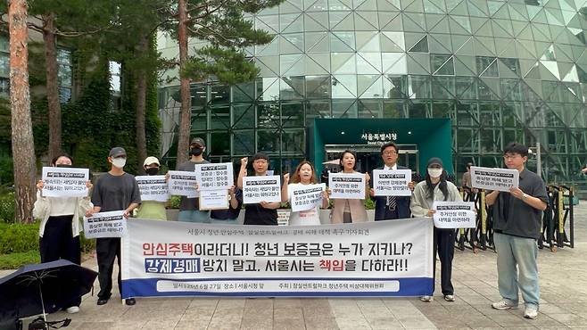 27일 오전 11시, 잠실센트럴파크 청년주택 비상대책위원회는 서울시청 앞에서 기자회견을 열어 강제 경매 중인 청년안심주택 세입자의 보증금 반환 및 주거권 보장을 위한 서울시의 대책 마련을 촉구했다.