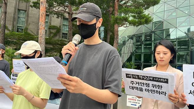 전세사기 피해자와 시민단체 활동가의 연대발언도 있었다. 전세사기·깡통주택 전국대책위원회 이철빈 위원장은 "서울시에서 안심하고 살 수 있다고 하니까 그걸 믿고 계약한 건데, 이렇게 발을 빼버리면 이건 허위·과장광고, 불공정거래 아니냐"며 "서울시는 우리 세입자들에게 얼마나 적극적으로, 구체적으로 문제 해결을 약속하는지 즉각 답하길 바란다"고 지적했다.