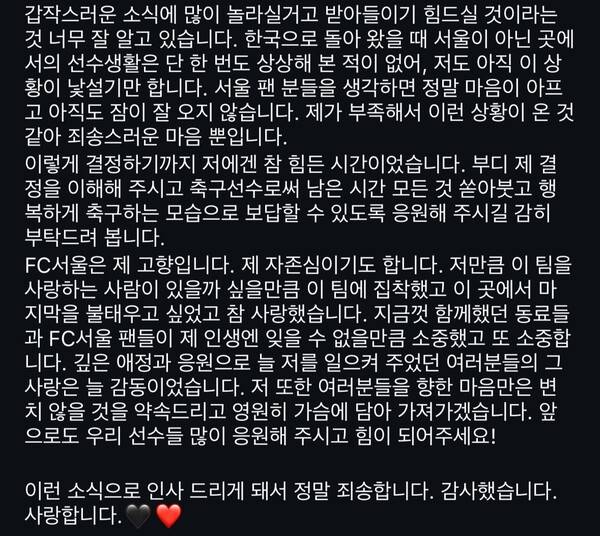 나아가 “FC서울은 제 고향입니다. 제 자존심이기도 합니다. 저만큼 이 팀을 사랑하는 사람이 있을까 싶을만큼 이 팀에 집착했고 이 곳에서 마지막을 불태우고 싶었고 참 사랑했습니다. 지금껏 함께했던 동료들과 FC서울 팬들이 제 인생엔 잊을 수 없을 만큼 소중했고 또 소중합니다. 깊은 애정과 응원으로 늘 저를 일으켜 주었던 여러분들의 그 사랑은 늘 감동이었습니다. 저 또한 여러분들을 향한 마음만은 변치 않을 것을 약속드리고 영원히 가슴에 담아 가져가겠습니다. 앞으로도 우리 선수들 많이 응원해 주시고 힘이 되어주세요!”라며 작별 인사를 건넸다.